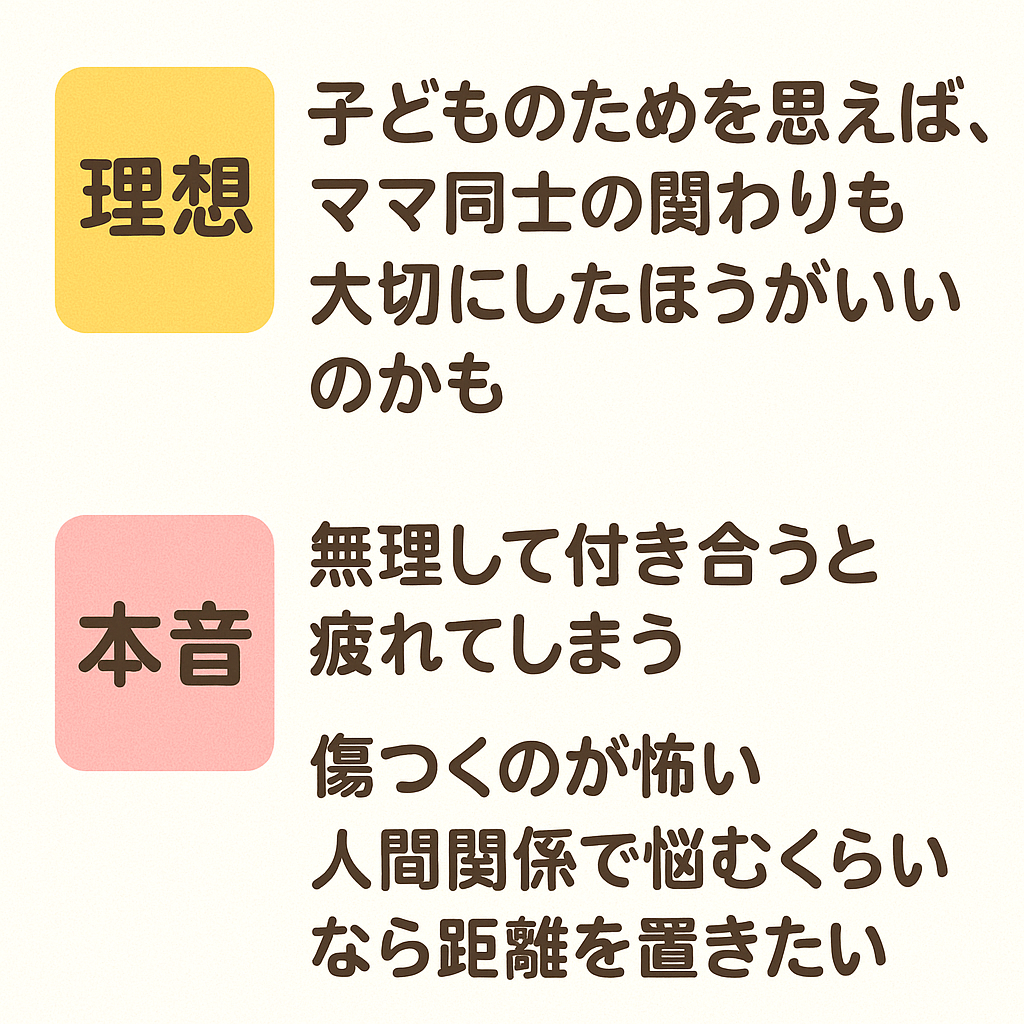 つまり、ママ友ができないのではなく「自分をすり減らさない距離感を選んでいる」だけと考えられますね。